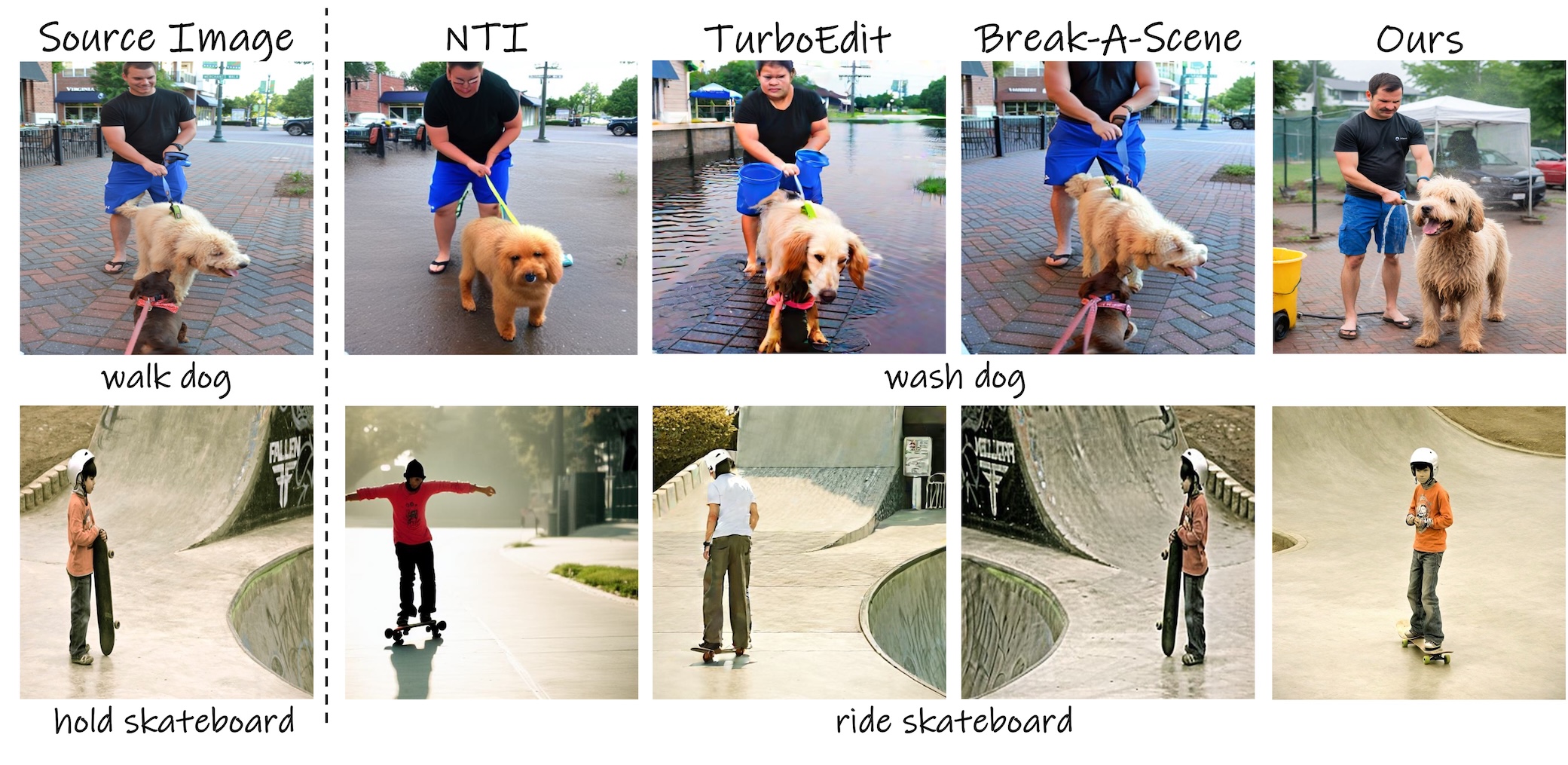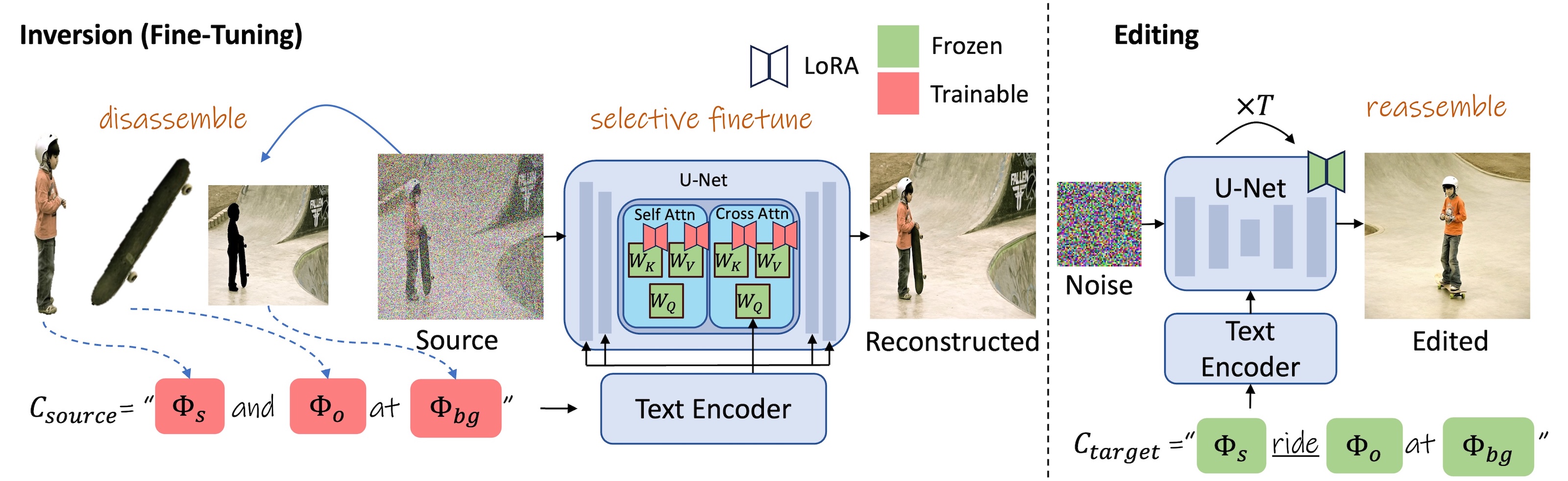 HOI components are disassembled into subject, object, and background clues during inversion. LoRA regularization enables non-rigid edits by capturing essential attributes while ignoring fine-grained structural details. Selective fine-tuning preserves interaction priors while adapting to the source image's identity. Editing reassembles these components with the target interaction, using trained LoRA weights to guide the diffusion model.